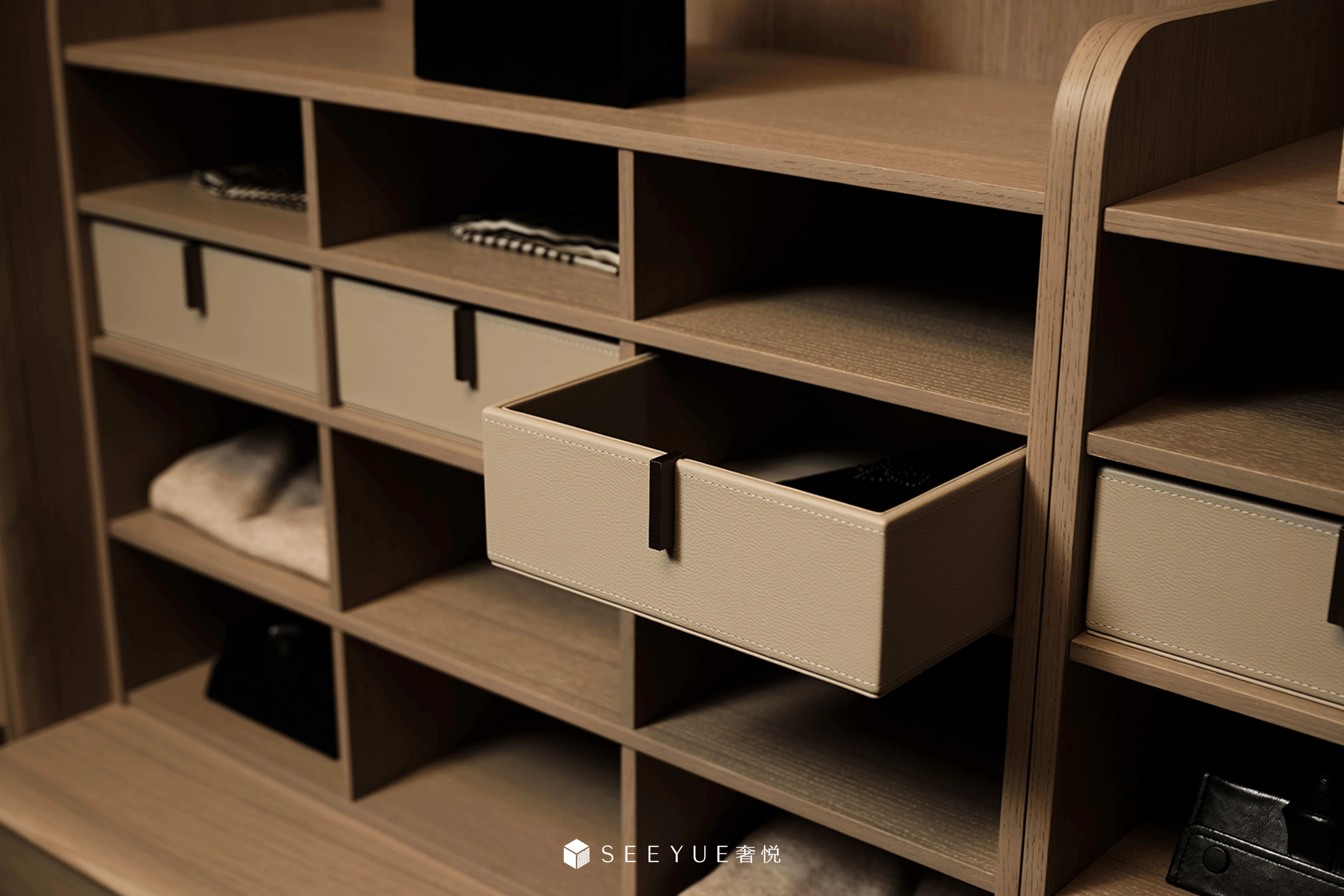 出來,樂享精致的生活。像呵護您的家人一樣,呵護您的每一件物品。在抽屜當中有隱藏式的抽屜風琴簾設計,同時還有定制皮