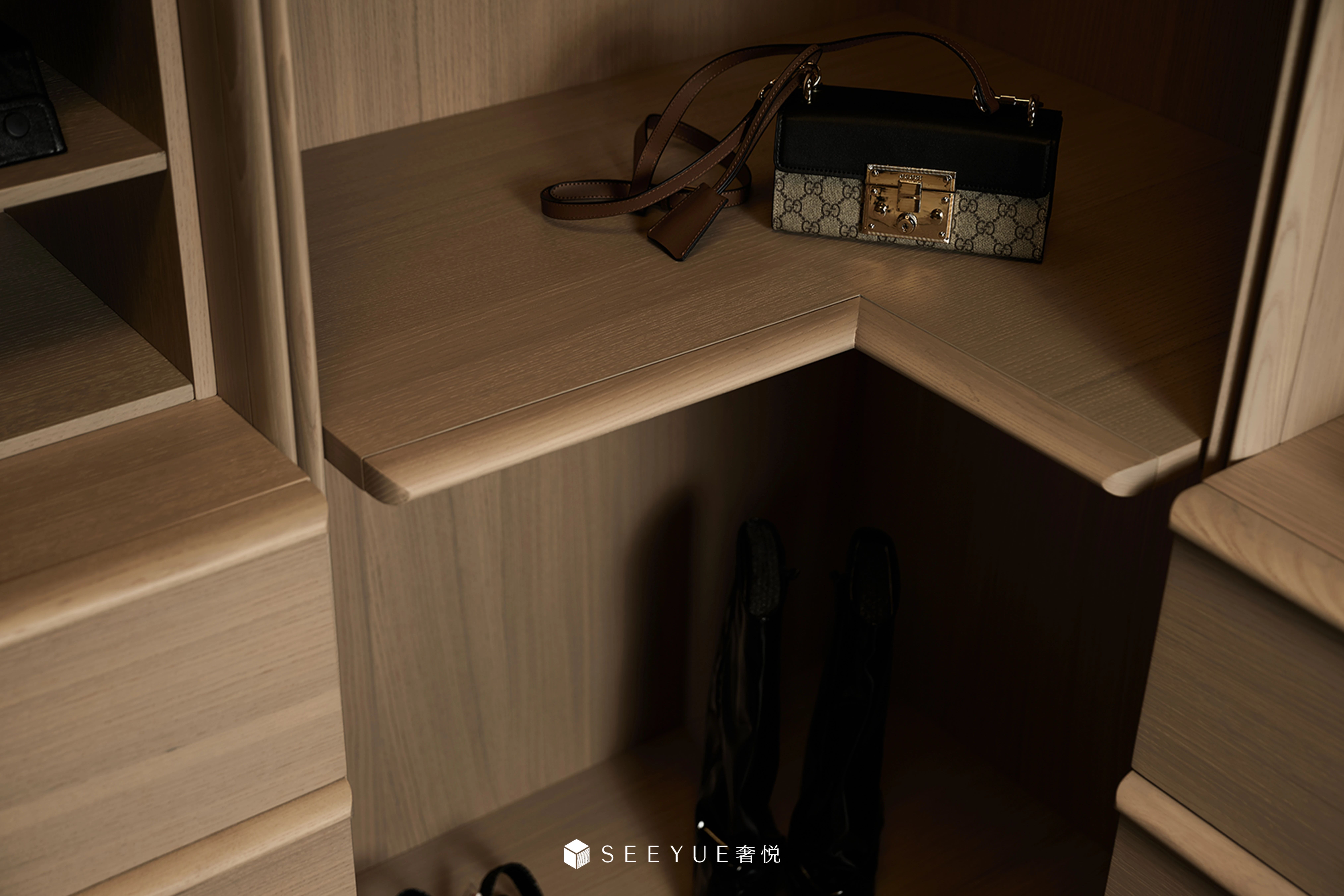 珀曉衣帽間:溫潤的顏色讓人對生活充滿了無盡的期待。歐橡原木的暖色帶來溫馨舒適的感覺,讓人從繁忙緊張的工作當中解脫