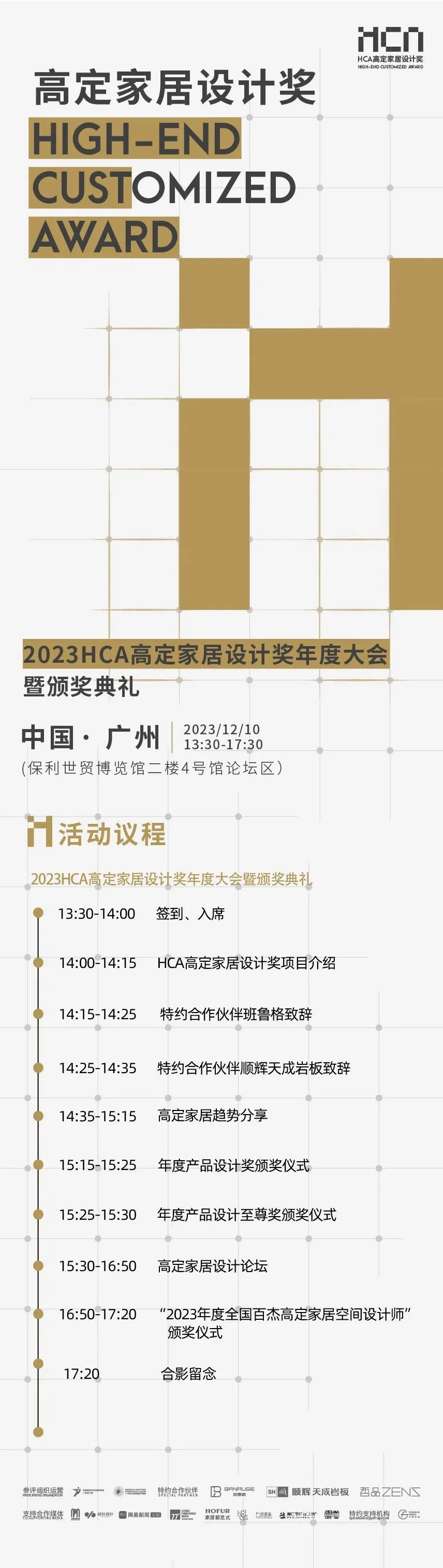 2023年12月10日,年度收官盛典「 2023HCA高定家居設計獎年度盛典」將在2023廣州設計周現(xiàn)場盛大開啟!同期將舉辦產品